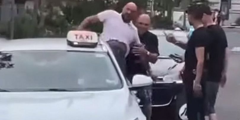 balanceándose pateando un taxi después de que su conductor le negara la entrada.