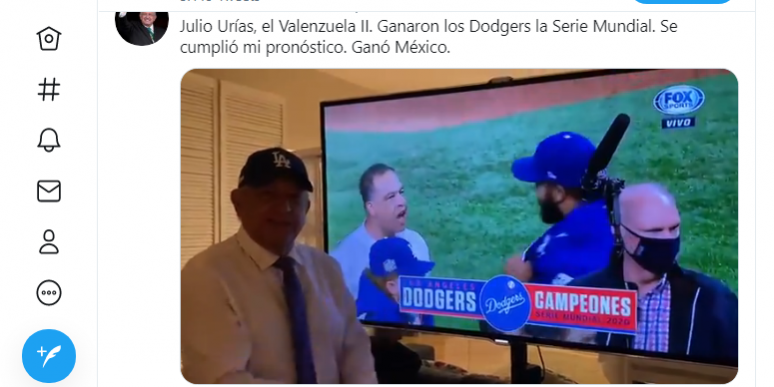 Por medio de un video que compartió en sus redes sociales, el mandatario recordó que él había vaticinado que los Dodgers llegarían an la Final, aunque no acertó en su oponente, ya que él dijo que jugarían ante Houston, pero su rival fueron finalmente las Rayas de Tampa Bay.